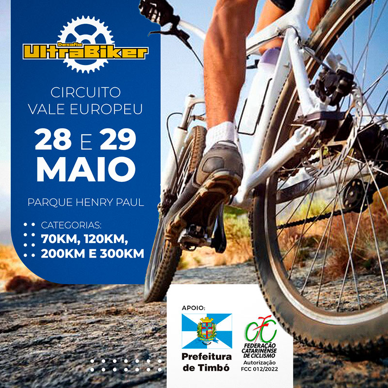 Estão abertas até o dia 20 de maio as inscrições para os interessados em participar do 1º Desafio Ultrabiker no Vale Europeu, que acontece nos dias 28 e 29 de maio, com largada do Parque Henry Paul, em Timbó, às 6h.