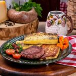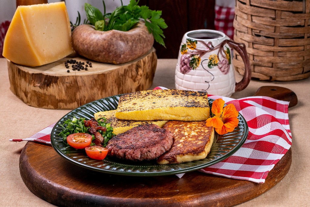 O Piatto Nostrano é servido com a tradicional polenta brustolada, que é a polenta cozida e, depois de fria, cortada em fatias e assada na chapa até formar o brustolado, que são aqueles pontinhos mais escuros, típicos daquilo que é assado na chapa ou na grelha. Ainda acompanha o queijo, que no caso é a “tosella”, que é uma fatia de um queijo branco fresco, frito na manteiga; a “lugànega, que é a linguiça, e dela é feita a massa da lugànega ou a pasta da linguiça. Depois é feita uma polpetta, um bolinho, que é achatado, assado e servido com as verduras comuns da temporada. Pensa na delícia!!!