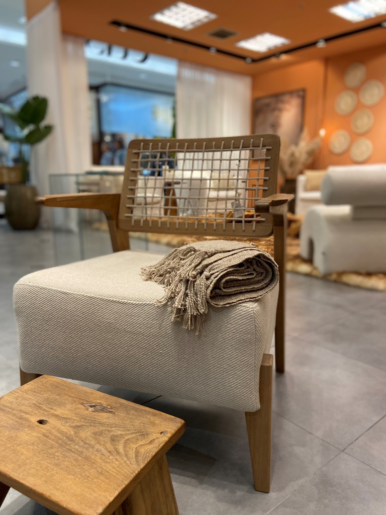 A natureza está presente na decoração mais do que nunca! A madeira harmoniza perfeitamente com essa atmosfera natural, com peças como a mesa de centro de tronco, por exemplo. Outros materiais que casam bem com a proposta são a corda, a palha e demais fios naturais. No espaço “Vivências”, por exemplo, ele aparece em objetos decorativos, nas cadeiras e no ombrelone feito à mão. Para compor esse clima invernal, aposte também em vasos com pampas, flores ou galhos secos.