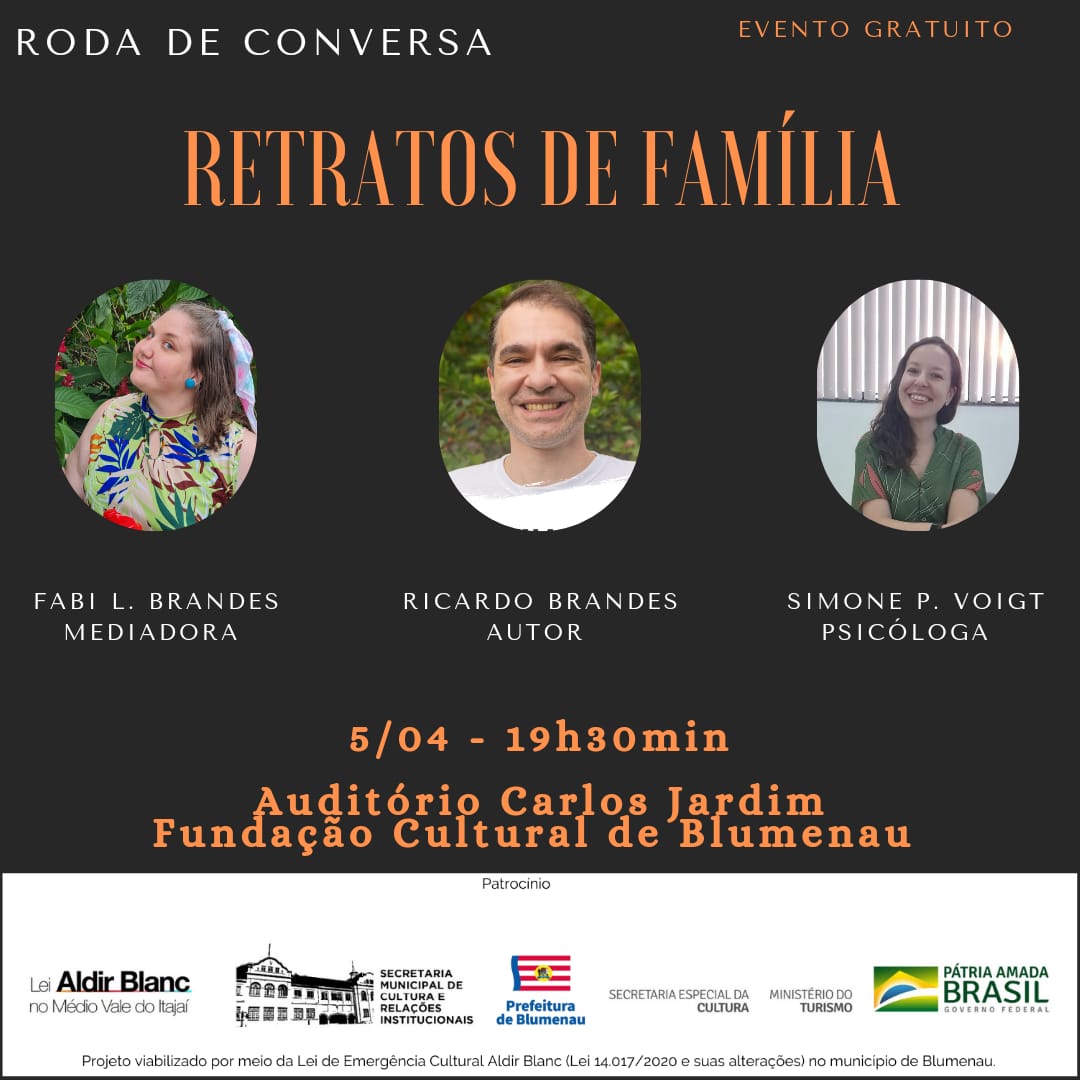 O Projeto “Retratos de Família: A Violência Contra a Mulher na Psicologia e Literatura”, de Ricardo Brandes, é aprovado pela Lei de Emergência Cultural Aldir Blanc (Lei nº 14.017/2020) no município de Blumenau.