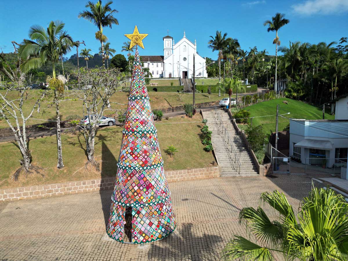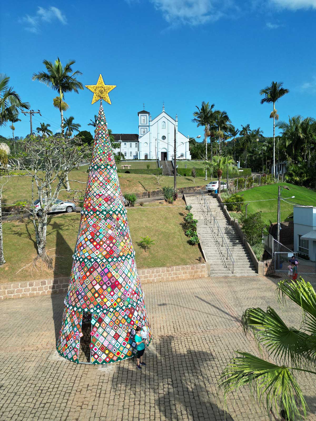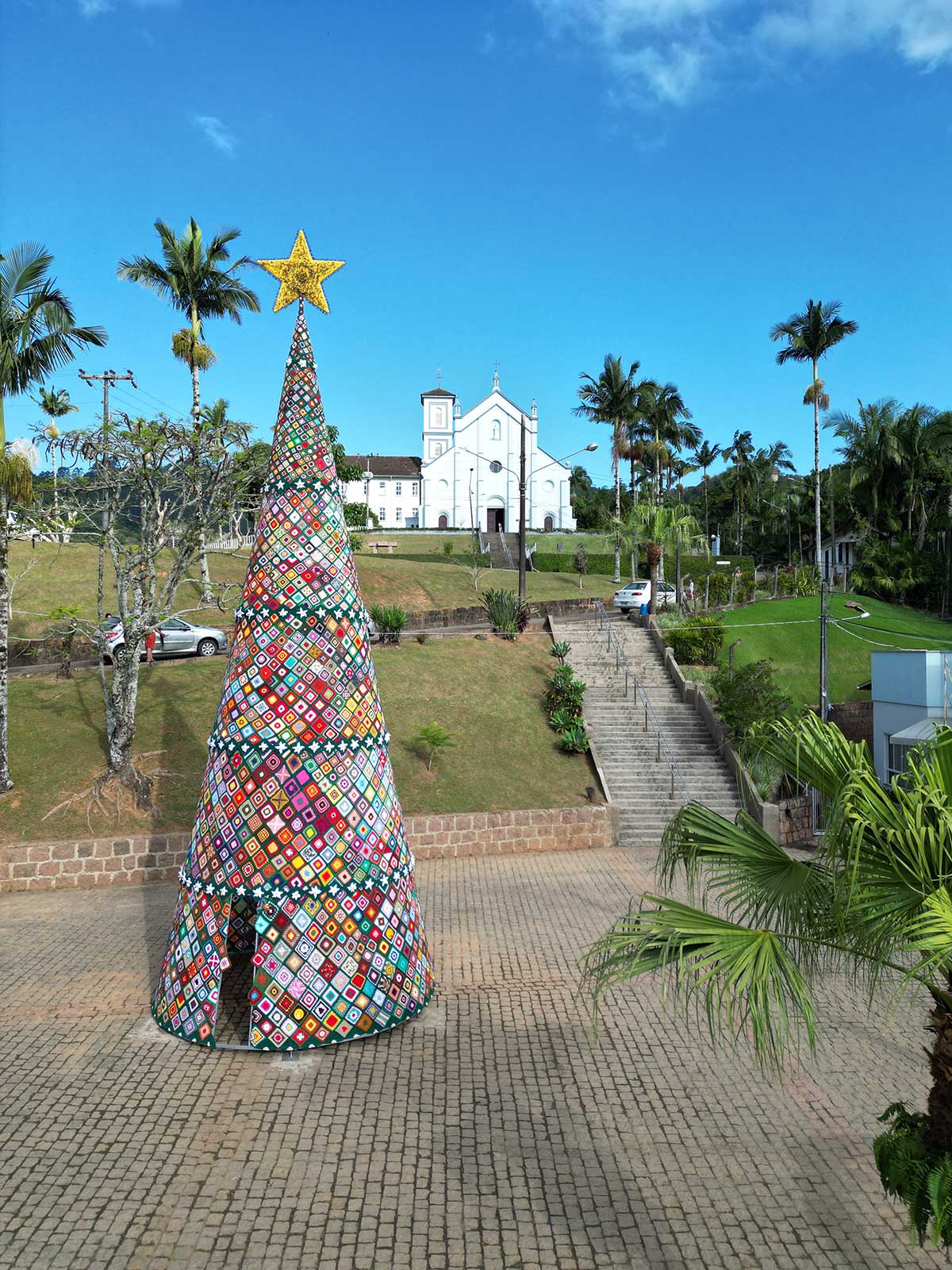 A maior árvore de Natal em crochê do Brasil ganha vida no pátio da Igreja Matriz