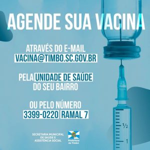 Abril 6, 2020A partir de hoje, dia 6 de abril, a vacinação contra a Influenza para os idosos acontece em quatro locais específicos de nossa cidade: nos bairros Araponguinhas, Capitais, Nações e Pomeranos. O único horário de vacinação será das 13h30 às 16h. Em Timbó, cerca de 90% dos idosos já se vacinaram.