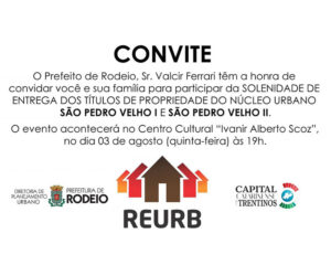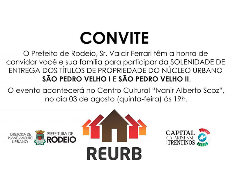 A Prefeitura de Rodeio convida você e sua família para a SOLENIDADE DE ENTREGA das matrículas para os proprietários que aderiram ao REURB. Neste dia será entregue para o núcleo urbano SÃO PEDRO VELHO I e SÃO PEDRO VELHO II.