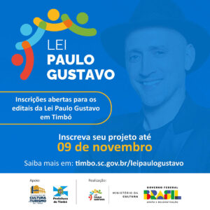 A Prefeitura de Timbó, através da Fundação de Cultura e Turismo, informa que estão abertas as inscrições dos editais de seleção de projetos com recursos da Lei Paulo Gustavo no município. Timbó possui dois editais.