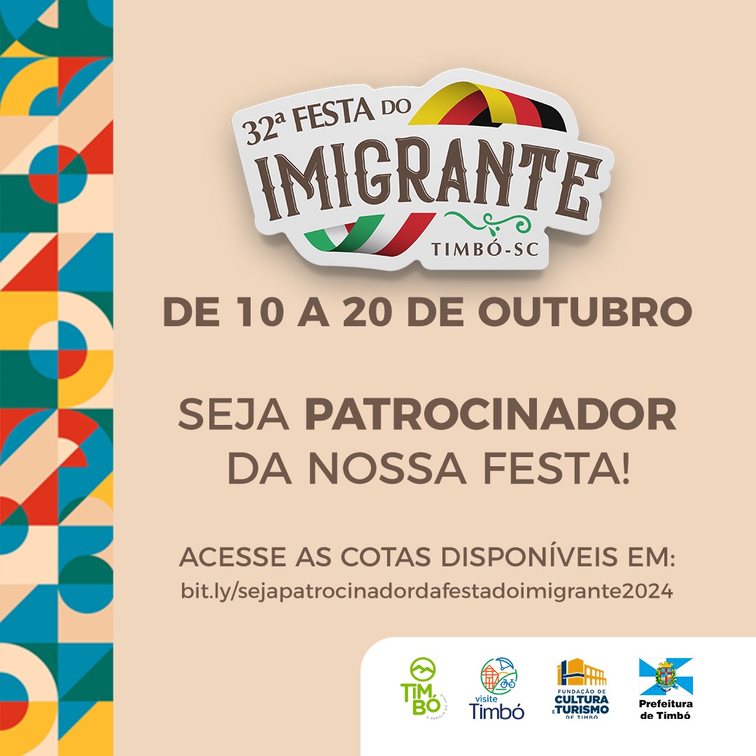 A Prefeitura de Timbó, através da Fundação de Cultura e Turismo, informa que está aberto o edital de chamamento para cotas de patrocínio na 32ª Festa do Imigrante, que acontece de 10 a 20 de outubro, no Parque Henry Paul.