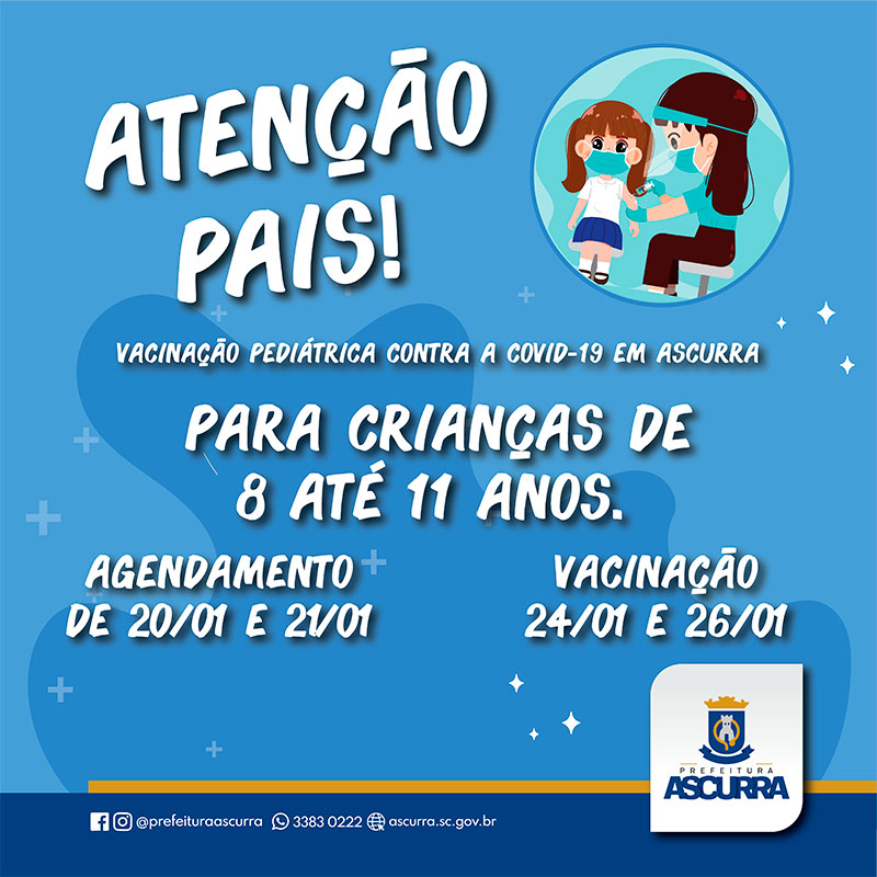 Está liberado o agendamento para vacinação contra a Covid-19 em crianças de 8 a 11 anos sem comorbidades ou deficiência. A Secretaria de Saúde de Ascurra inicia a aplicação das vacinas na próxima segunda-feira, dia 24 de janeiro, e é necessário o agendamento para a receber a primeira dose do imunizante. A vacinação acontecerá no ESF Dr. Armando Zonta, no centro, das 14h às 20h.