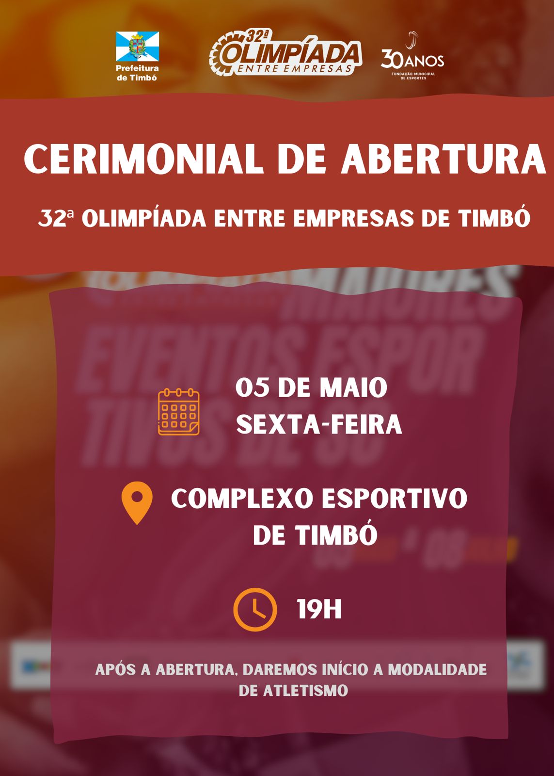 Nesta sexta-feira, dia 05 de maio, acontece a abertura oficial da 32ª Olimpíada Entre Empresas de Timbó – Troféu Grupo Cristal Rudolph 50 anos. É a partir das 19h, no Complexo Esportivo. Em caso de chuva, o evento será transferido para o Pavilhão de Eventos Henry Paul.