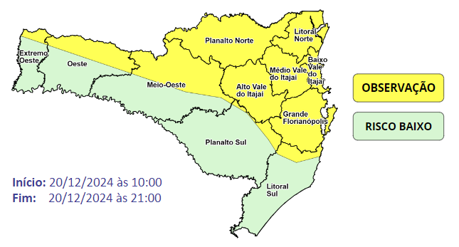 Nesta sexta-feira (20) a instabilidade permanece atuando sobre Santa Catarina, trazendo condições pra temporais isolados, sobretudo nas áreas de divisa com o Paraná. Nas áreas em amarelo do mapa o risco é moderado para ocorrências relacionadas a alagamentos, queda de galhos e árvores e destelhamentos, enquanto nas áreas em verde o risco é baixo.