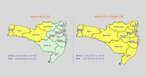 Entre a quinta-feira (16) e a madrugada do sábado (18) a formação e o avanço de uma frente fria voltam a favorecer condições para temporais isolados e chuva pontualmente intensa em Santa Catarina. O risco é baixo a moderado para ocorrências relacionadas a alagamentos, danos na rede elétrica, destelhamentos e queda de galhos de árvores.