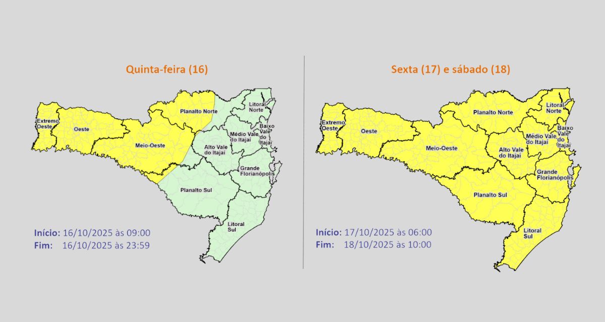 A partir da manhã da quinta-feira (16) a instabilidade avança pelo Oeste e áreas de divisa com o RS e se espalha para as demais regiões no decorrer do dia. Os temporais de maior intensidade são esperados no Grande Oeste e parte do Planalto Norte entre a tarde e a noite. Estes, podem vir acompanhados de raios, rajadas de vento e eventual queda de granizo.