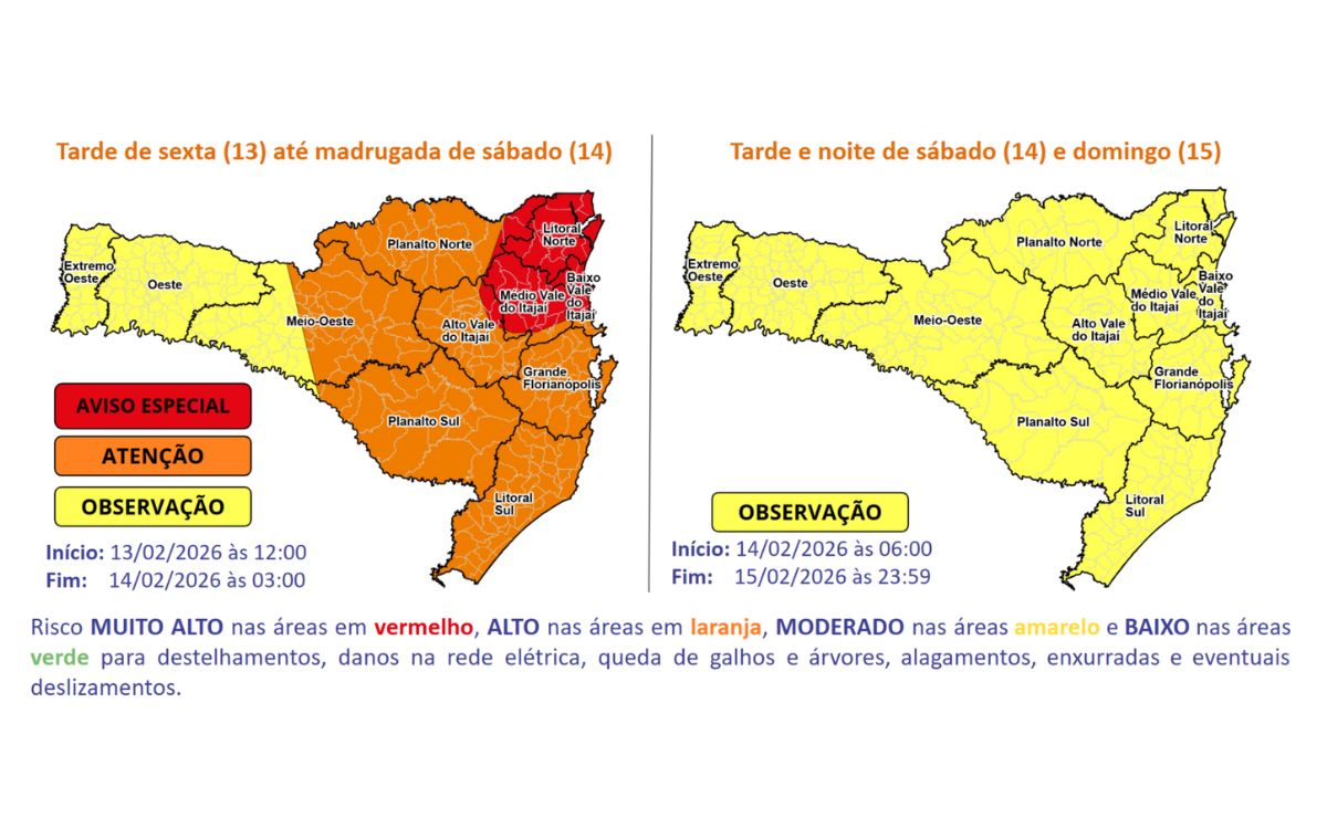 Entre as tardes e noites da sexta-feira (13) e do domingo (15), a circulação dos ventos em diferentes níveis da atmosfera, somada ao intenso calor e grande quantidade de umidade, aumenta as condições para temporais com chuva intensa em todas as regiões de Santa Catarina, trazendo risco MODERADO a ALTO para ocorrências relacionadas a alagamentos, enxurradas e eventuais destelhamentos. Em áreas entre o Vale do Itajaí, Litoral Norte e pontos da Grande Florianópolis serrana são esperados altos volumes de chuva, com risco MUITO ALTO para alagamentos, enxurradas e deslizamentos pontuais.