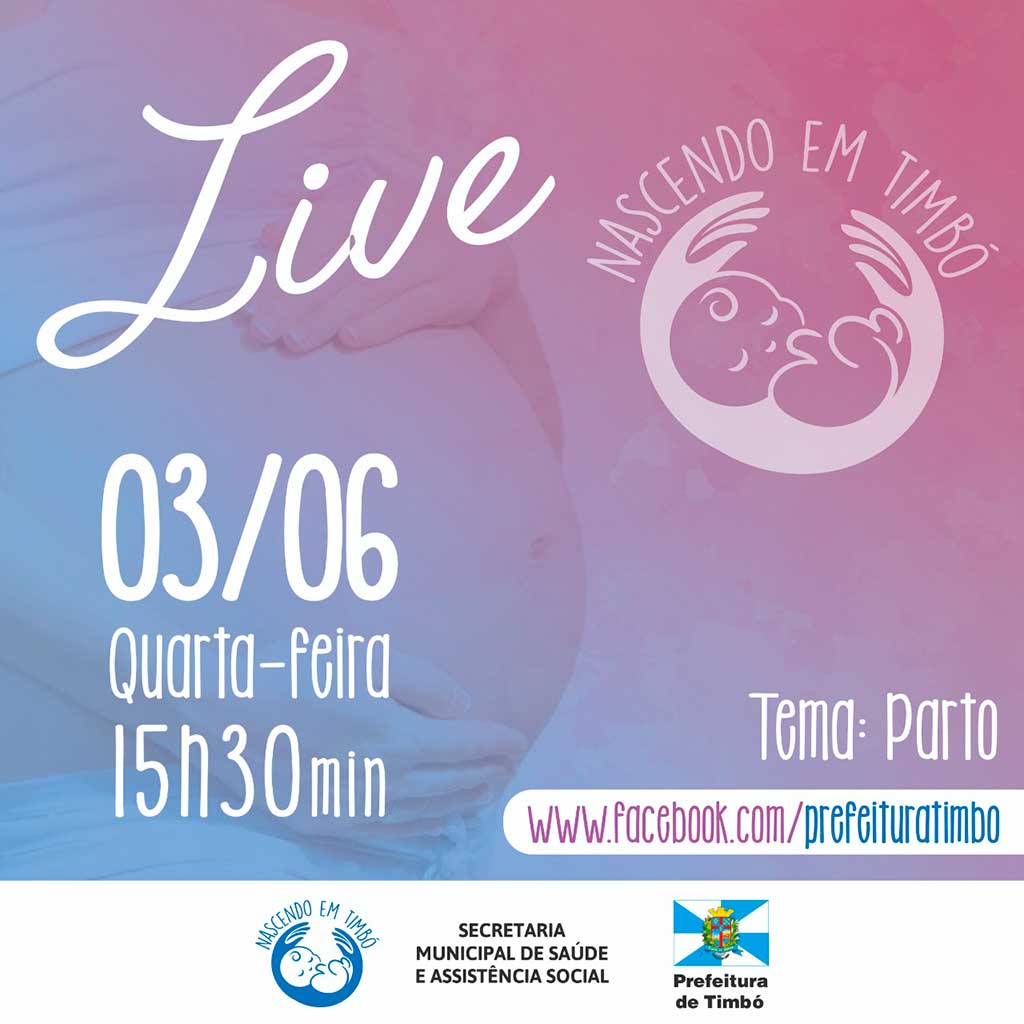 Junho 2, 2020Atenção gestantes: amanhã, dia 3 de junho, a partir das 15h30, a enfermeira Margot Friedmann Zetsche e a médica obstetra e ginecologista, Carla Cristine da Silva e a enfermeira especialista em Yoga e práticas interativas, Gabi Miller, estarão ao vivo aqui no facebook da Prefeitura de Timbó para desvendar os mitos do parto.