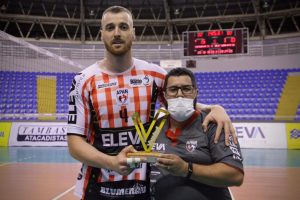 BLUMENAU (SC) – A expectativa de equilíbrio se confirmou. O confronto entre APAN/Eleva/Blumenau e Montes Claros/América, na tarde do último sábado (20/01), se transformou numa batalha com 2h07min de duração. A disputa considerada de “seis pontos” terminou com vitória do time blumenauense por 3 a 2 (Parciais de 25/18, 18/25, 31/29, 24/26, 15/10). O oposto Franco foi o principal destaque, como maior pontuador. Foram 34 bolas dele caindo na quadra adversária – três em lances de bloqueio e 31 em jogadas de ataque (69% de aproveitamento nesse fundamento). De quebra, levou o Troféu Viva Vôlei.