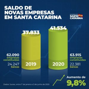 Junho 5, 2020A confiança dos empreendedores catarinenses segue alta apesar da pandemia de Covid-19. Dados da Junta Comercial do Estado de Santa Catarina (Jucesc) mostram um saldo positivo de 41.534 novas empresas no estado, entre 1º de janeiro e 3 de junho de 2020. O resultado é 9,8% superior ao mesmo período do ano passado, quanto o saldo era de 37.833 (62.090 empresas constituídas e 24.247 baixas).