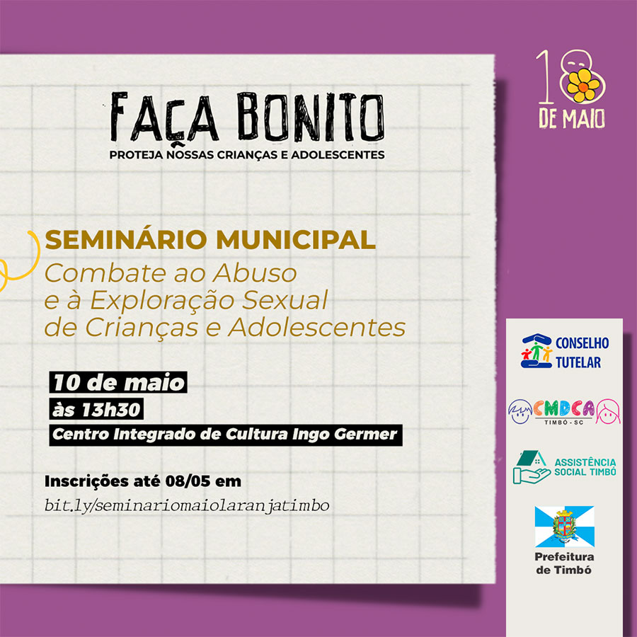 Estão abertas as inscrições para os interessados em participar do Seminário Municipal sobre Combate ao Abuso e à Exploração sexual de crianças e adolescentes, promovido pela Assistência Social e Conselho Municipal dos Direitos da Criança e do Adolescente (CMDCA).