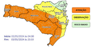 Atenção Meteorológica Defesa Civil SC – Temporais com chuva intensa e volumosa entre a quinta (02) e a sexta-feira (03)