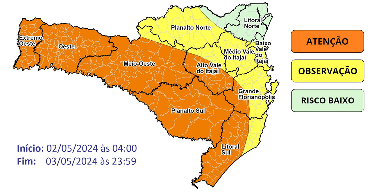 Os acumulados entre a quinta (02) e a sexta-feira (03) devem variar entre 150 e 200 mm no Extremo Oeste, Oeste e em áreas do Meio-Oeste, Planalto Sul e Litoral Sul que fazem divisa com o RS, podendo pontualmente superar estes valores. Na metade norte do Meio-Oeste, Planalto Sul, Litoral Sul e nas áreas em laranja do Alto Vale do Itajaí e Grande Florianópolis, os volumes devem ficar em torno dos 100 mm. É importante ter em mente que as previsões meteorológicas estão divergindo em relação à posição da frente fria, o que pode resultar em acumulados diferentes aos que estão sendo projetados, que podem ser tanto sub quanto superestimados.