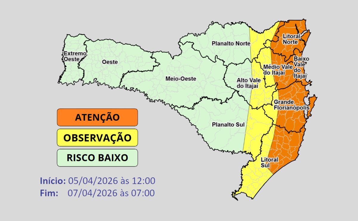 O aprofundamento gradual de uma área de baixa pressão sobre o interior do continente a intensificação do transporte de umidade do mar em direção à costa catarinense favorecem a ocorrência de chuva persistente no Litoral e temporais isolados nas demais regiões do estado entre a tarde deste domingo (05) e a madrugada da próxima terça-feira (07), oferecendo risco MODERADO a ALTO para ocorrências relacionadas à alagamentos e enxurradas. Para destelhamentos, danos na rede elétrica e queda de galhos e árvores, o risco é BAIXO.