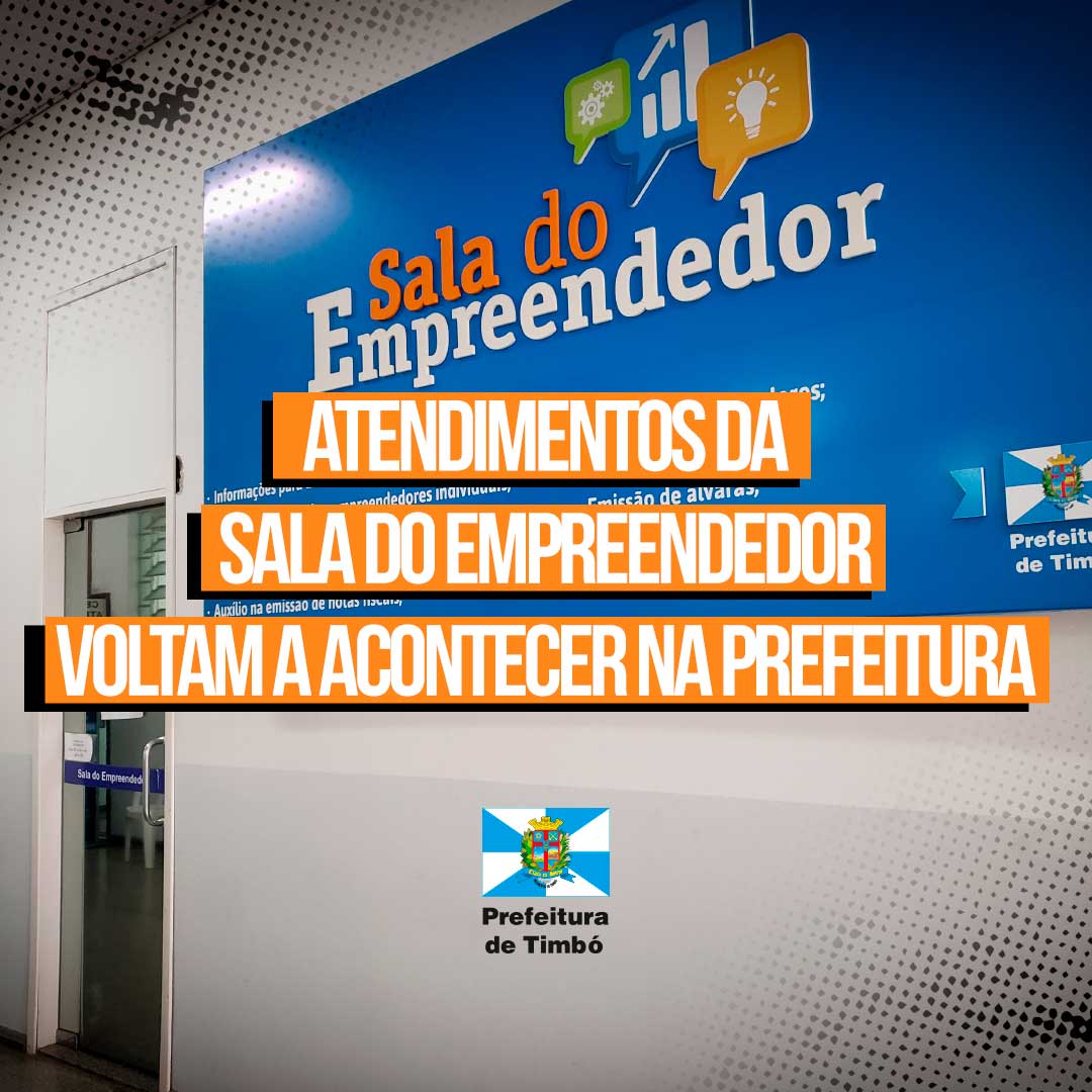 Junho 18, 2020A partir da próxima segunda-feira, dia 22 de junho, a Sala do Empreendedor volta a realizar seus atendimentos no primeiro piso da Prefeitura de Timbó. Devido à pandemia do Coronavírus, esse suporte havia sido ampliado e estava acontecendo na Sociedade Cultural desde o dia 13 de abril.