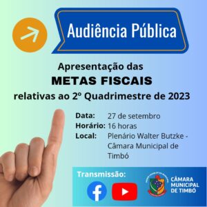 No dia 27 de setembro, quarta-feira, a Câmara Municipal de Timbó, através da Comissão de Orçamento, Finanças e Contas Públicas, vai realizar Audiência Pública para demonstração e avaliação das Metas Fiscais, pelo Poder Executivo, relativas ao segundo quadrimestre de 2023. A Audiência acontecerá no Plenário Walter Butzke, da Câmara, a partir das 16 horas.