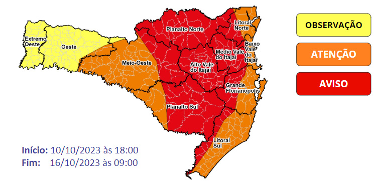 As condições geológicas para deslizamentos estão em níveis de alerta para as regiões de Planaltos e todo o Vale do Itajaí, devido ao acumulado de chuvas registradas no estado nos últimos dias. Com o acúmulo de precipitação juntamente com as previsões meteorológicas de atenção para chuvas volumosas, principalmente quarta (11) e quinta feira (12), todas as regiões do estado já apresentam solo encharcado e ocorrências pontuais de movimentação de massa. Dessa forma, recomenda-se atentar-se aos sinais como, rachaduras em paredes e encostas, inclinação de postes, árvores e muros e água vertendo do solo.