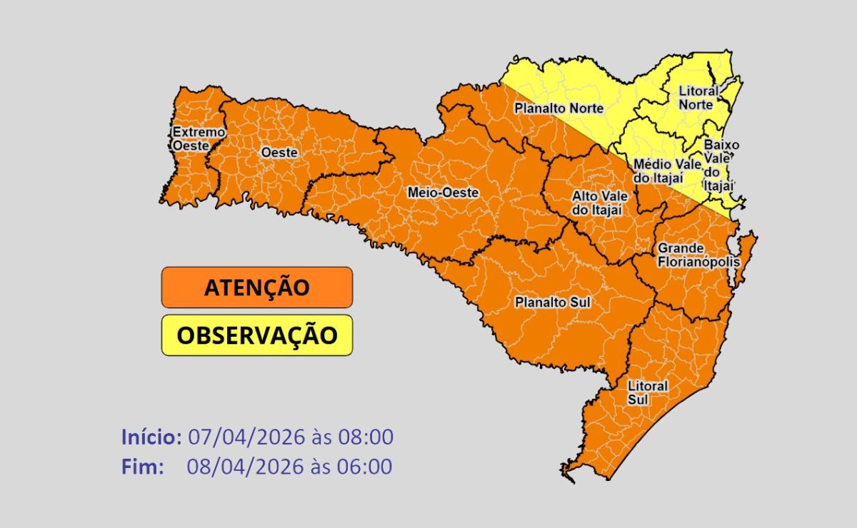 Os temporais devem começar pelo Extremo Oeste, Oeste e Meio-Oeste, regiões próximas à divisa com o RS, ainda pela manhã e início da tarde, avançando pelas demais regiões – Planalto Sul, Litoral Sul, Planaltos, Grd. Florianópolis, Vale do Itajaí e Litoral Norte, ao longo da tarde e noite de terça (07) e madrugada de quarta (08).