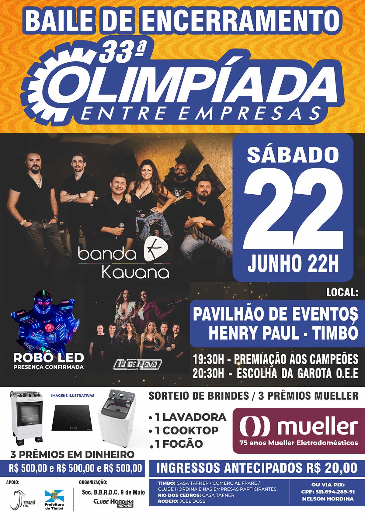 O evento tem início às 19h30, com a premiação dos campeões. Às 20h30 será feita a Escolha da Garota OEE. Saiba quem são as candidatas aqui. https://www.timbo.sc.gov.br/fundacao-municipal-de-esportes/2024/saiba-quem-sao-as-candidatas-da-escolha-da-garota-da-33a-olimpiada-entre-empresas/