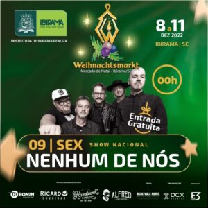 Neste dia 9 de dezembro, o palco do Pavilhão de Eventos Manoel Marchetti receberá a banda gaúcha, Nenhum de Nós, uma das grandes atrações do Weihnachtsmarkt – Mercado de Natal de Ibirama.