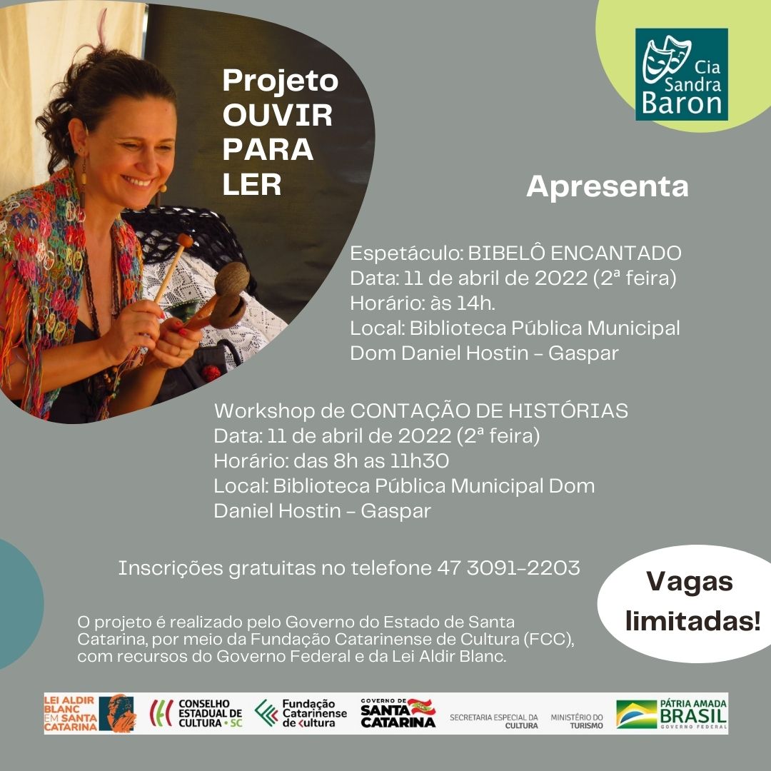 Ouvir pra Ler é um projeto de incentivo à leitura em que o espetáculo Bibelô Encantado, da Cia Sandra Baron, fará uma apresentação nas bibliotecas públicas municipais de Balneário Piçarras, Bombinhas, Brusque e Gaspar. O público-alvo do espetáculo são estudantes entre 6 e 12 anos que estão alfabetizados ou em fase de alfabetização. Além disso, será disponibilizada uma oficina de contação de histórias de três horas de duração para professores, monitores, bibliotecários e interessados em geral.