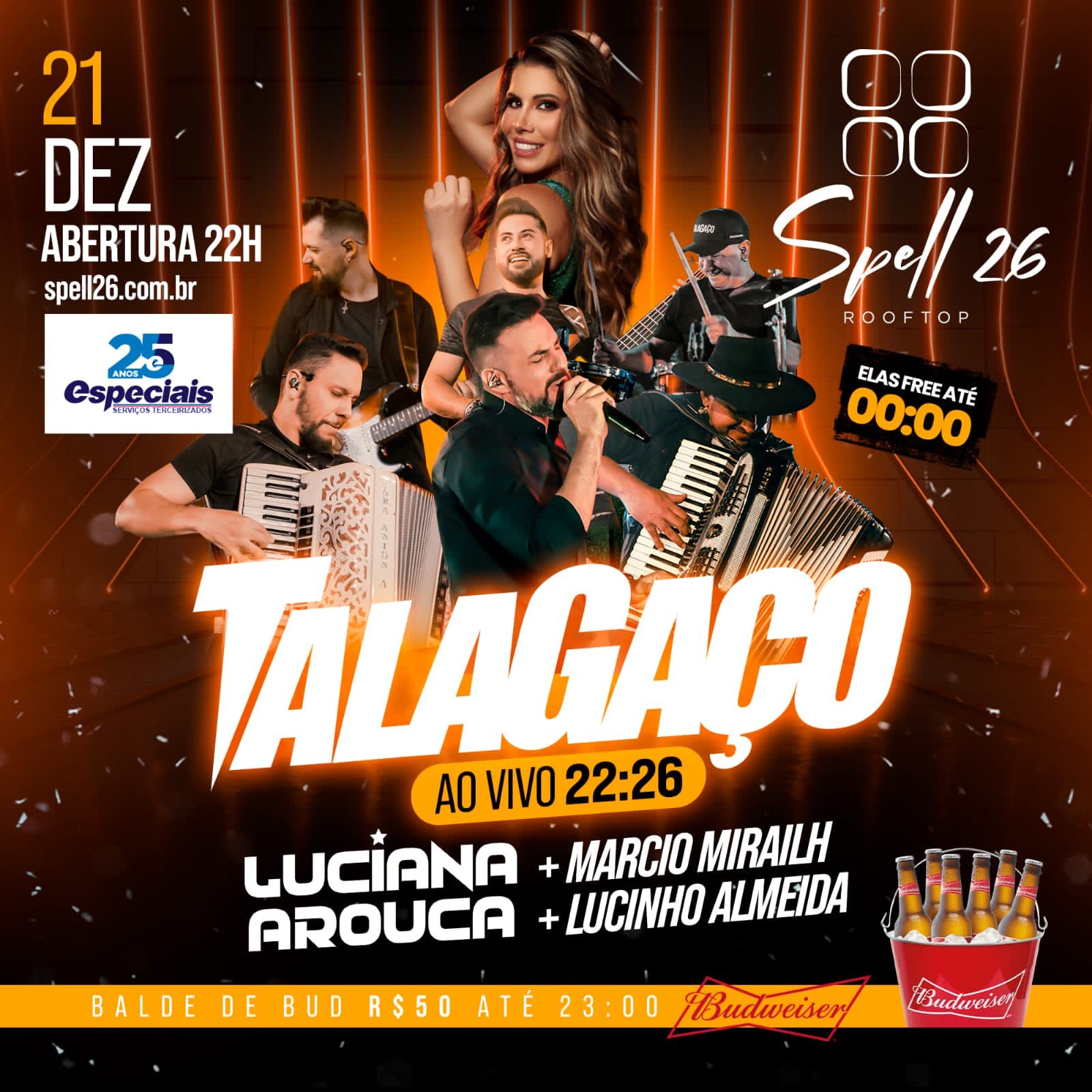 Em mais uma ação para promover o melhor da música brasileira, o Spell 26, considerado o maior rooftop em Shopping center do Brasil, traz a Blumenau o show nacional do Grupo Talagaço, donos dos hits “Vou Tomar Birita”, “Eu To Bebendo Todas” e “Amor de Rodeio”. O grupo comanda o palco do Spell na quinta-feira (21), a partir das 22 horas. A noite também ficará por conta dos Djs residentes Luciana Arouca e Márcio Mirailh , além da presença especial do Dj Lucinho Almeida.