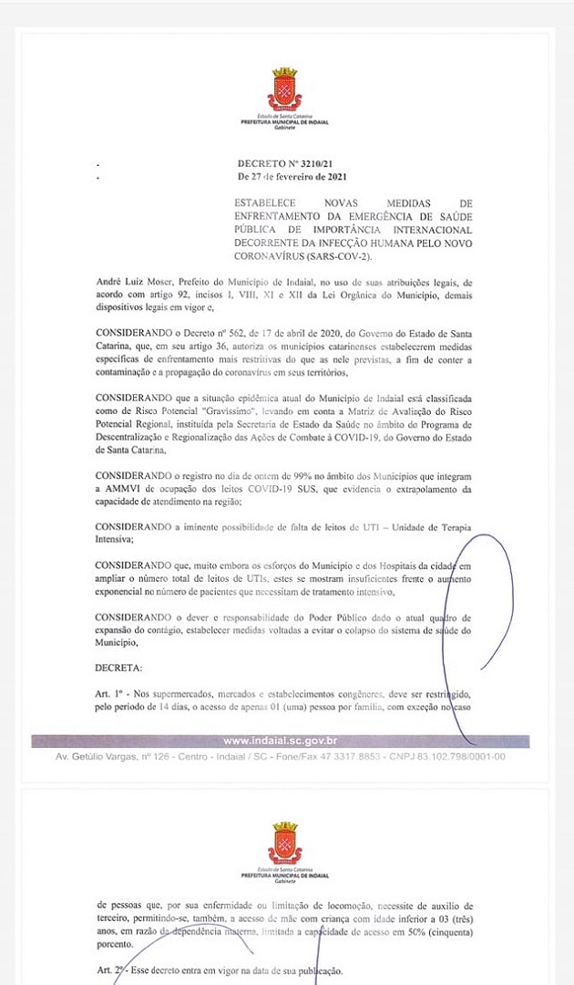 Na tarde de sábado, dia 27 de fevereiro, o prefeito de Indaial, André Moser, assinou o Decreto nº 3210/21, que estabelece novas medidas de enfrentamento à crise de saúde pública de importância internacional decorrente da infecção humana da Covid-19.