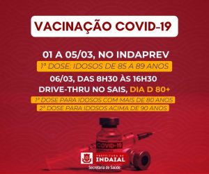 Nesta semana, a Secretaria de Saúde de Indaial dá prosseguimento à campanha de vacinação contra a Covid-19 e amplia a imunização para novos grupos de idosos. Usuários com idade entre 85 a 89 anos poderão fazer seu agendamento para serem imunizados de segunda (1º) a sexta (5) no Indaprev (rua Marechal Floriano Peixoto, 80, Centro).