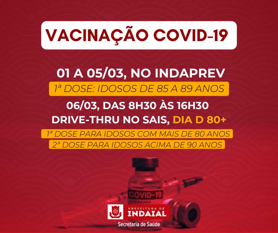 Já no sábado (6) a Secretaria realiza o Dia D 80+, das 8h30 às 16h30, no Sais (rua Leoberto Leal, bairro Tapajós), no modelo drive-thru (sem precisar sair do carro). Na ocasião serão vacinados com a 1ª dose os usuários com mais de 80 anos e com a 2ª dose os idosos acima de 90 anos. É preciso apresentar Cartão do SUS e documento com foto.
