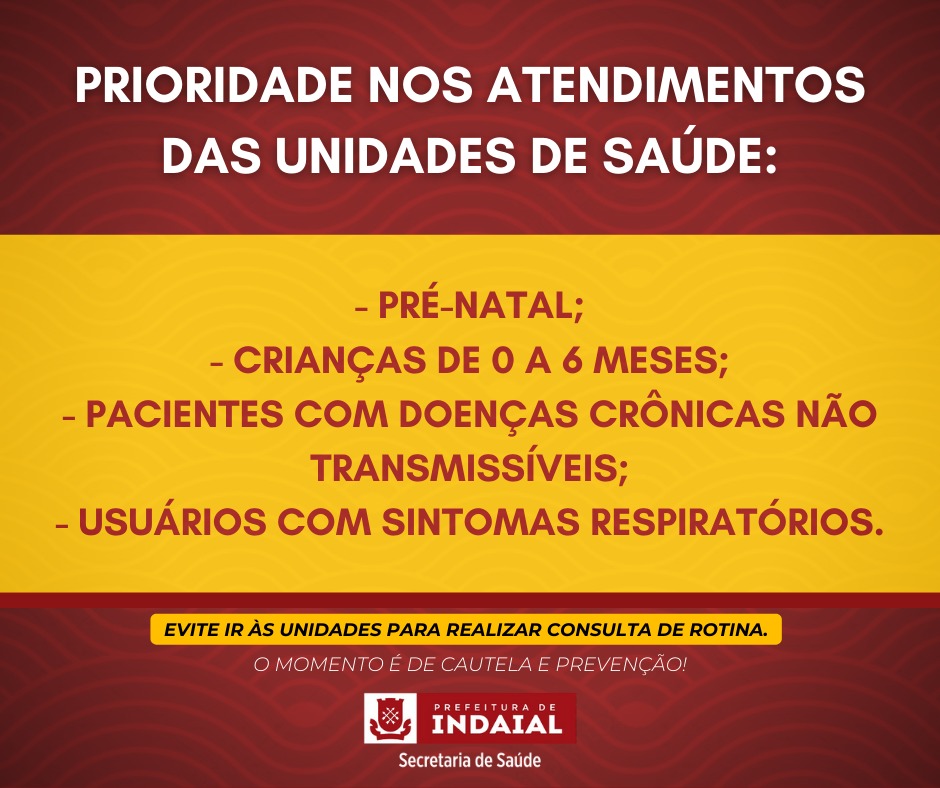 Com o aumento dos casos de Covid-19, a Secretaria de Saúde de Indaial tem priorizado os atendimentos disponibilizados nas Unidades. Neste momento, os usuários devem evitar procurar a rede para consultas e solicitação de exames de rotina.