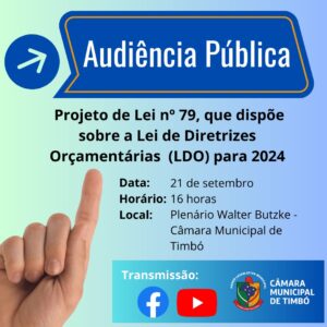 A Câmara Municipal de Timbó vai realizar no dia 21 de setembro, quinta-feira, a partir das 16 horas, uma Audiência Pública que vai discutir o Projeto de Lei Ordinária nº 79, de 01 de setembro de 2023, que trata sobre a Lei de Diretrizes Orçamentárias (LDO) para o exercício do ano de 2024. A Audiência acontecerá no Plenário Walter Butzke, da Câmara, através da Comissão de Orçamento, Finanças e Contas Públicas.