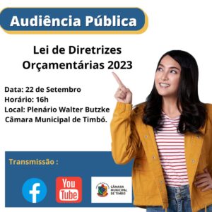 Sob a coordenação da Comissão de Orçamento, Finanças e Contas Públicas, a Câmara Municipal de Timbó realiza, na quinta-feira, dia 22 de setembro, Audiência Pública para apresentação e discussão do projeto de lei n.º 65, de 29 de agosto de 2022, que dispõe sobre a elaboração da Lei de Diretrizes Orçamentárias para 2023 e dá outras providências.