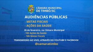 A Câmara de Vereadores de Timbó realizará no dia 26 de fevereiro, duas audiências públicas, a partir das 15h, no Plenário da Câmara.