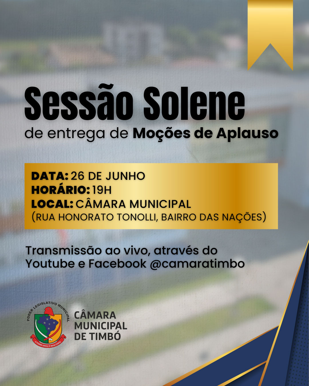 Na próxima semana, no dia 26 de junho, a Câmara de Vereadores de Timbó realiza Sessão Solene para entrega de Moções de Aplauso, feitas pelos vereadores ao longo deste primeiro semestre. Confira abaixo quem serão os homenageados.