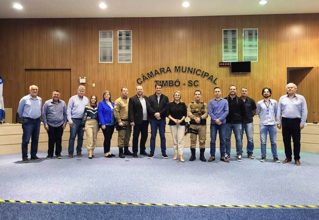 Ao final da Sessão, os vereadores se reuniram, no Plenário, com o Comandante da 2ª Companhia do 32º Batalhão de Polícia Militar, em Timbó, Major Fábio Verdasca de Luca, e também com a presença do Sargento Maicon Otto.