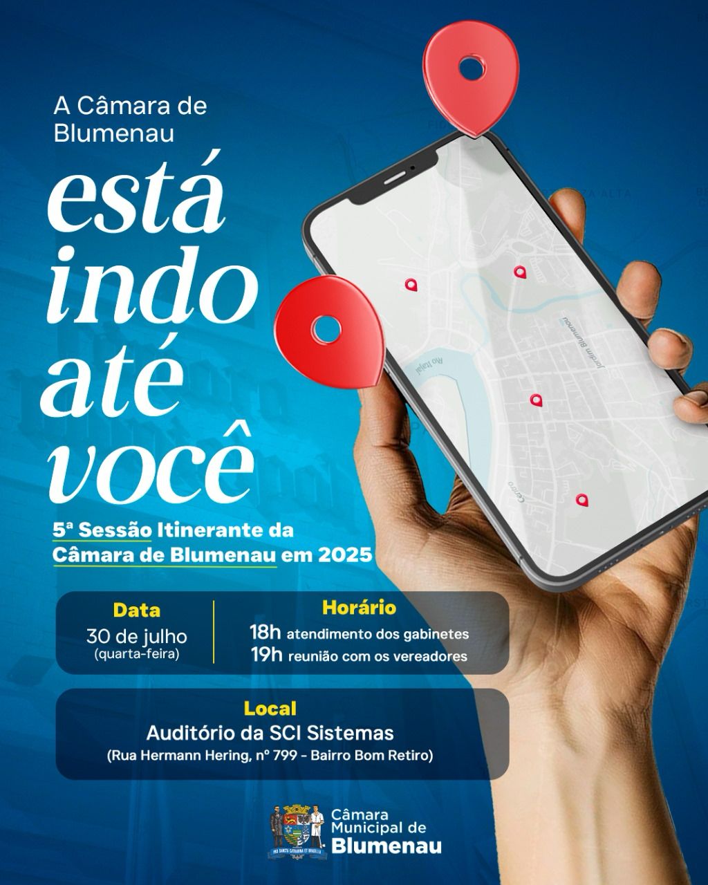 Atenção você que mora nos bairros Bom Retiro, Centro, Jardim Blumenau e Ribeirão Fresco. Neste mês, a sessão itinerante da Câmara de Vereadores de Blumenau vai ser na sua comunidade.