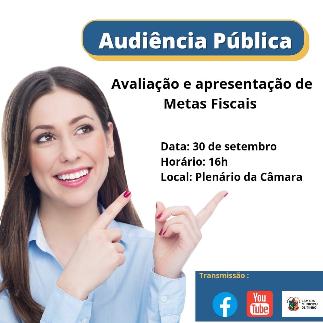 No próximo dia 30 de setembro, às 16h, a Câmara Municipal de Timbó, irá realizar uma Audiência Pública para avaliação do cumprimento das Metas Fiscais Municipais, referentes ao segundo quadrimestre de 2021, em atendimento ao disposto no §4.º do art. 9º da Lei Complementar Federal n.º 101/2000.