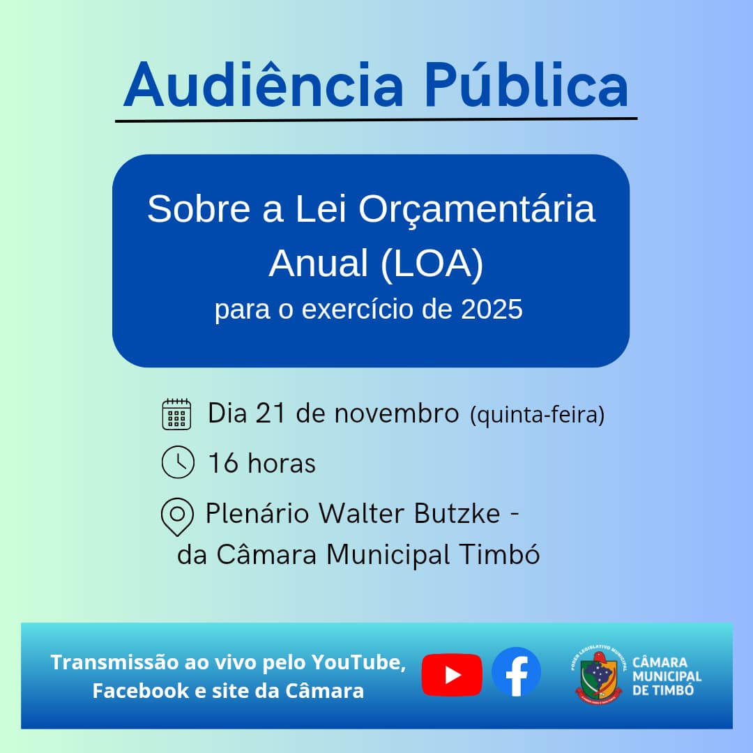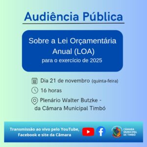 No dia 21 de novembro, quinta-feira, a Câmara Municipal de Timbó, através da Comissão de Orçamento, Finanças e Contas Públicas, vai realizar Audiência Pública para debater sobre o Projeto de Lei Ordinária nº 39/2024, que estima a Receita e fixa a Despesa do Município de Timbó, para o exercício financeiro de 2025, ou seja, sobre a Lei Orçamentária Anual (LOA).