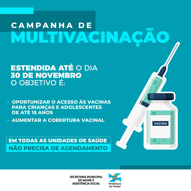 A Secretaria de Saúde de Timbó informa que a Campanha de Multivacinação foi estendida até o dia 30 de novembro.