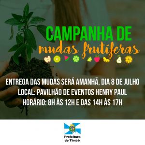 Julho 7, 2020A Campanha de Mudas Frutíferas já encerrou e as entregas irão acontecer nesta quarta-feira, dia 8 de julho, no Pavilhão de Eventos do Parque Henry Paul. O horário para a retirada será das 8h às 12h e das 14h às 17h.