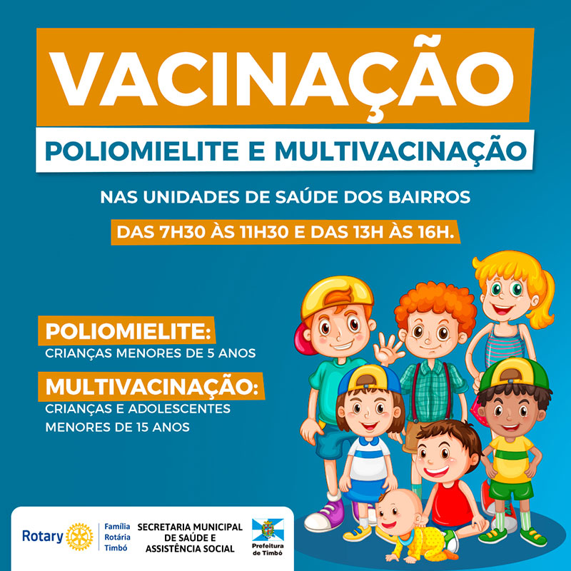 A Prefeitura de Timbó, através da Secretaria de Saúde, informa que a Campanha Nacional de Vacinação contra a Poliomielite e a Campanha Nacional de Multivacinação para Atualização da Caderneta de Vacinação de menores de 15 anos foram prorrogadas até 30 de setembro.