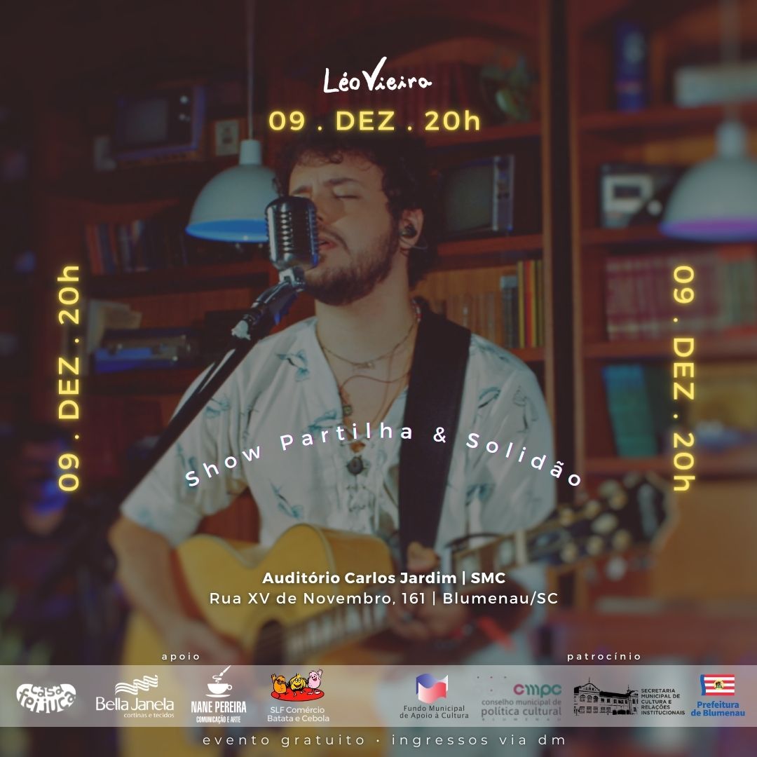 Música pop-folk. No dia 9 de dezembro, às 20h, o cantor e compositor Léo Vieira faz show de lançamento do álbum Partilha & Solidão, no Auditório Carlos Jardim, na Secretaria de Cultura, em Blumenau. Com entrada gratuita, os 80 ingressos disponíveis podem ser reservados com antecedência pelo WhatsApp (47) 9 9243-9789, com Soila Freese, ou pelo Instagram do artista. Acompanhado pelo músico Gian Puppo, Léo Vieira apresentará um espetáculo intimista em formato voz + violões. O repertório contará com canções do novo álbum na íntegra, alguns destaques da carreira do artista, além de releituras de clássicos, referências de Vieira, como Almir Sater e Harry Styles.