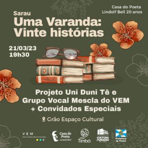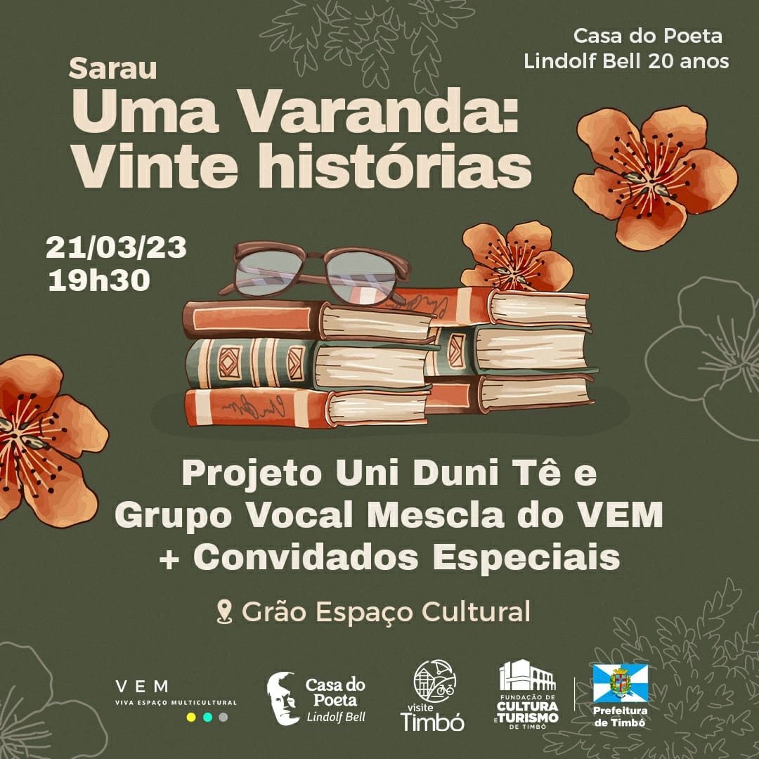 Na próxima terça-feira, dia 21 de março, a Casa do Poeta Lindolf Bell, em parceria com o VEM – Viva Espaço Multicultural de Timbó, promovem o sarau “Um varanda: vinte histórias”. Será às 19h30, no Grão Espaço Cultural, anexo à Casa do Poeta.
