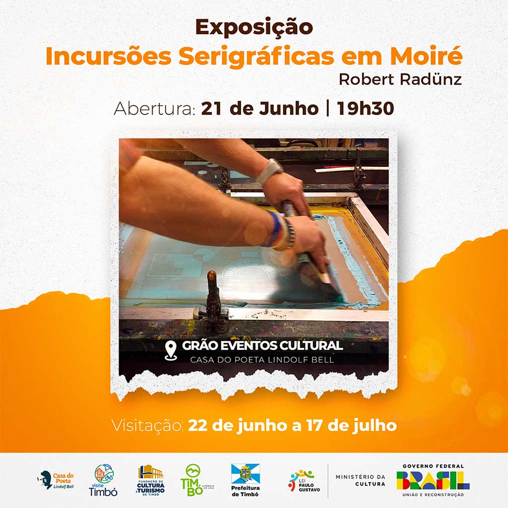 Na próxima sexta-feira, dia 21 de junho, a Casa do Poeta Lindolf Bell realiza a abertura da nova exposição “Incursões Serigráficas em Moiré”, do artista plástico Robert Radünz, que chega ao Grão Espaço Cultural, anexo à Casa. Será às 19h30, gratuito, aberto à comunidade e com intérprete de libras.