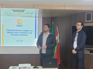 Na sequência, Leonardo Almeida, analista de empréstimo da CELOS, e Vilson Rocha, da divisão de Gestão Administrativo Financeira, ministraram a palestra “Compreendendo a origem e a relação entre dinheiro e as emoções humanas”, que teve como proposta o debate sobre como o fator psicológico interfere na forma com que as pessoas lidam com o dinheiro.