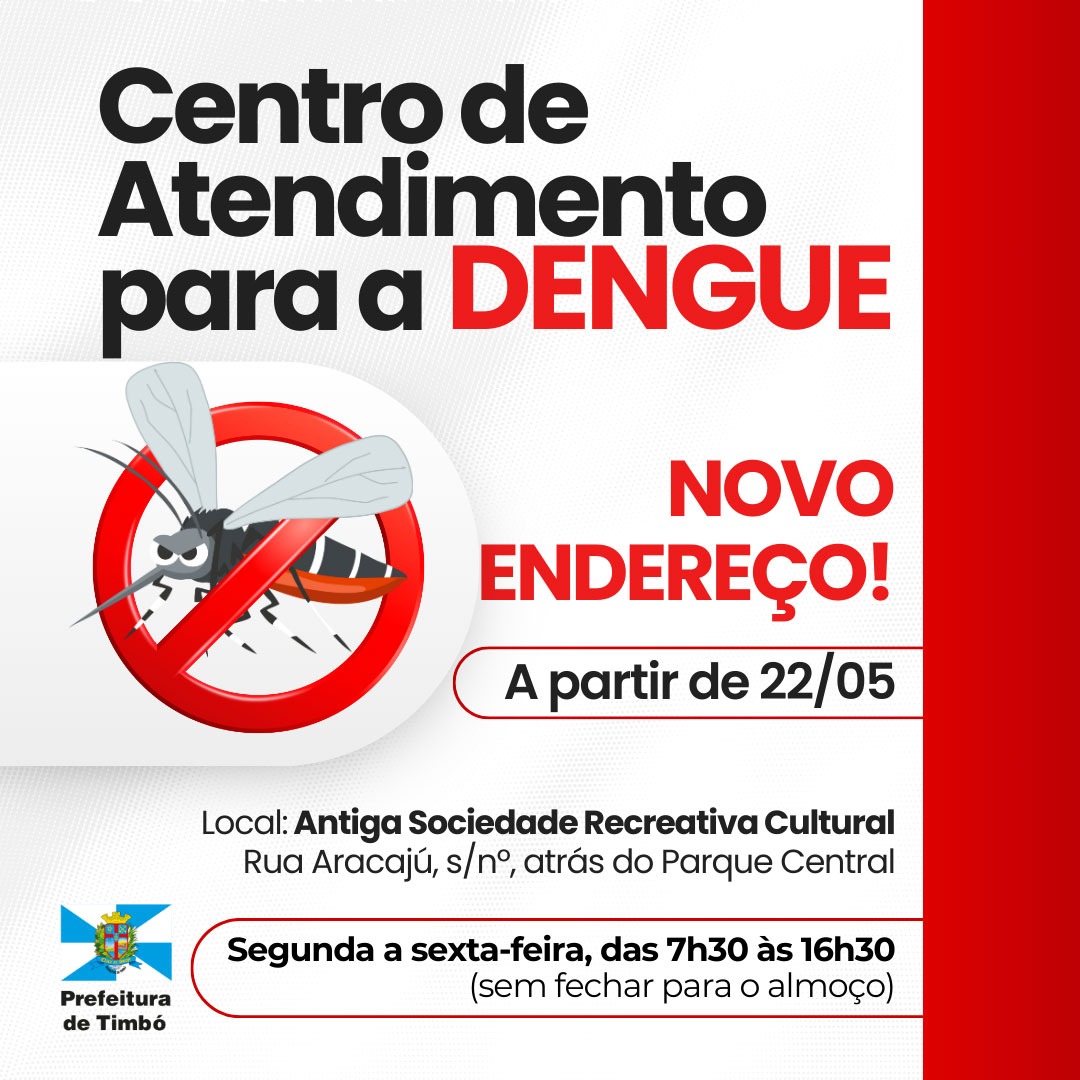 A Secretaria de Saúde de Timbó informa que nesta semana haverá mudança de endereço do CAD – Centro de Atendimento à Dengue. Por isso, nesta terça-feira (21) até quarta-feira ao meio dia, o atendimento será suspenso para a mudança e adaptação dos equipamentos ao novo espaço. E na quarta-feira, dia 22, a partir das 13h, o CAD retorna com os atendimentos na antiga Sociedade Recreativa e Cultural, atrás do Parque Central.
